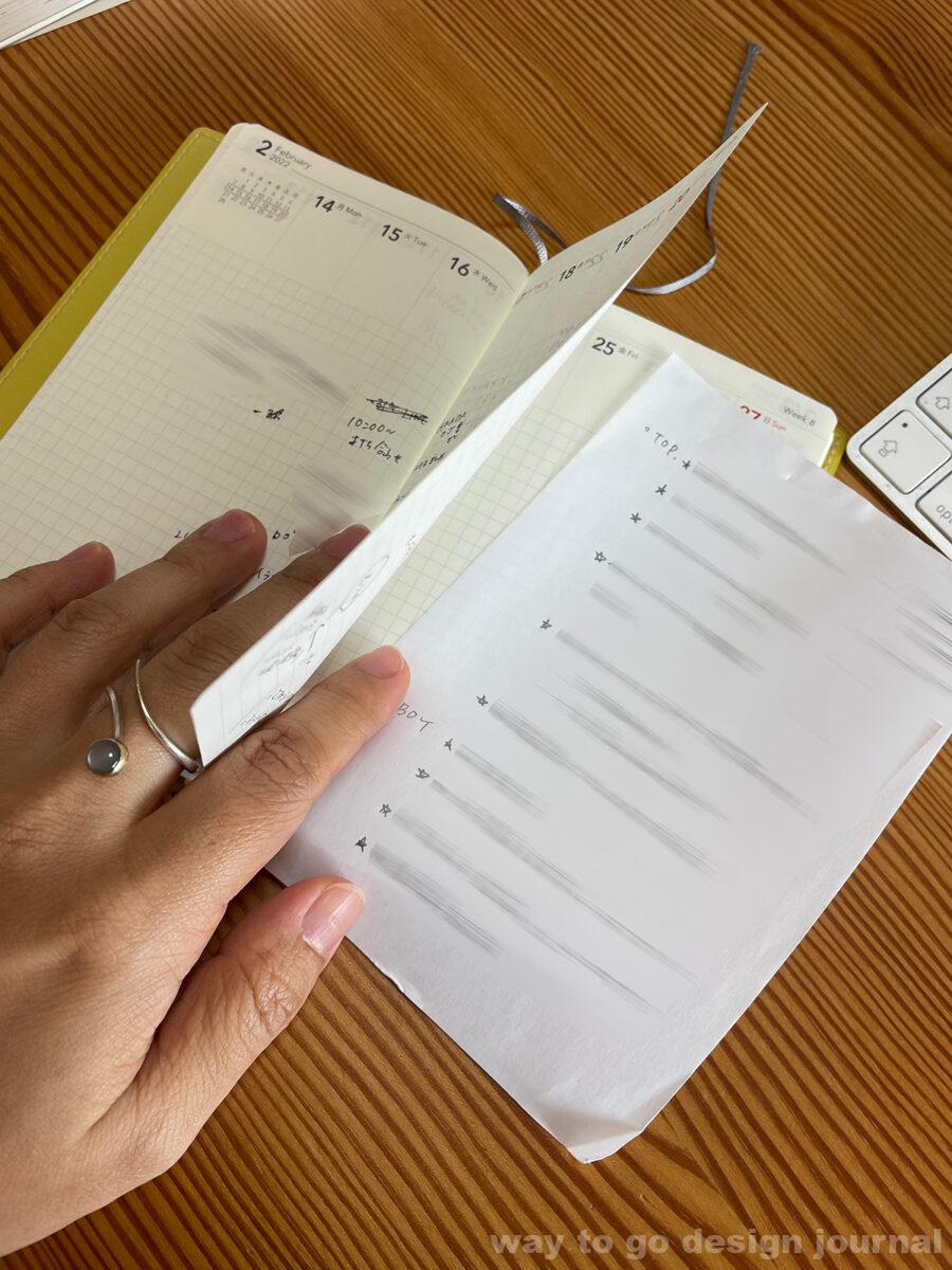 これが実際の手帳の様子。手のひらくらいのサイズなので、小さい&今週は業務内容の特性でTODOの項目が多すぎて別紙を足していますが、これを一冊にしてめくっていくと、日記の代わりになってかなり気に入っています。